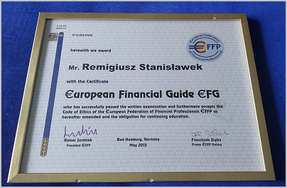 - Certyfikowany Doradca Finansowy EFG (European Financial Guide) organizacji EFFP